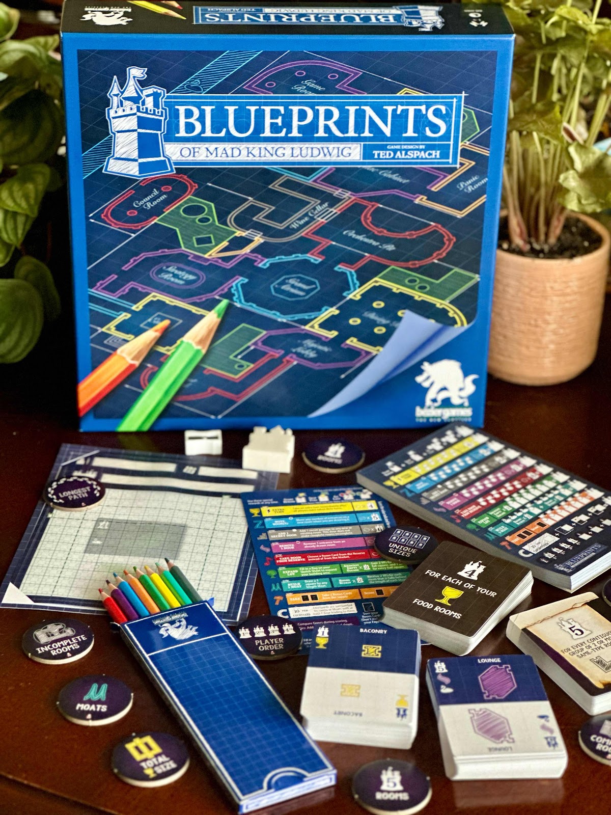 If you love the idea of designing your own castle; if you love Tetris-type, puzzle-y games; if you like flip and write games, or if you just love coloring pretty papers, Blueprints of Mad King Ludwig just may be the game for you!