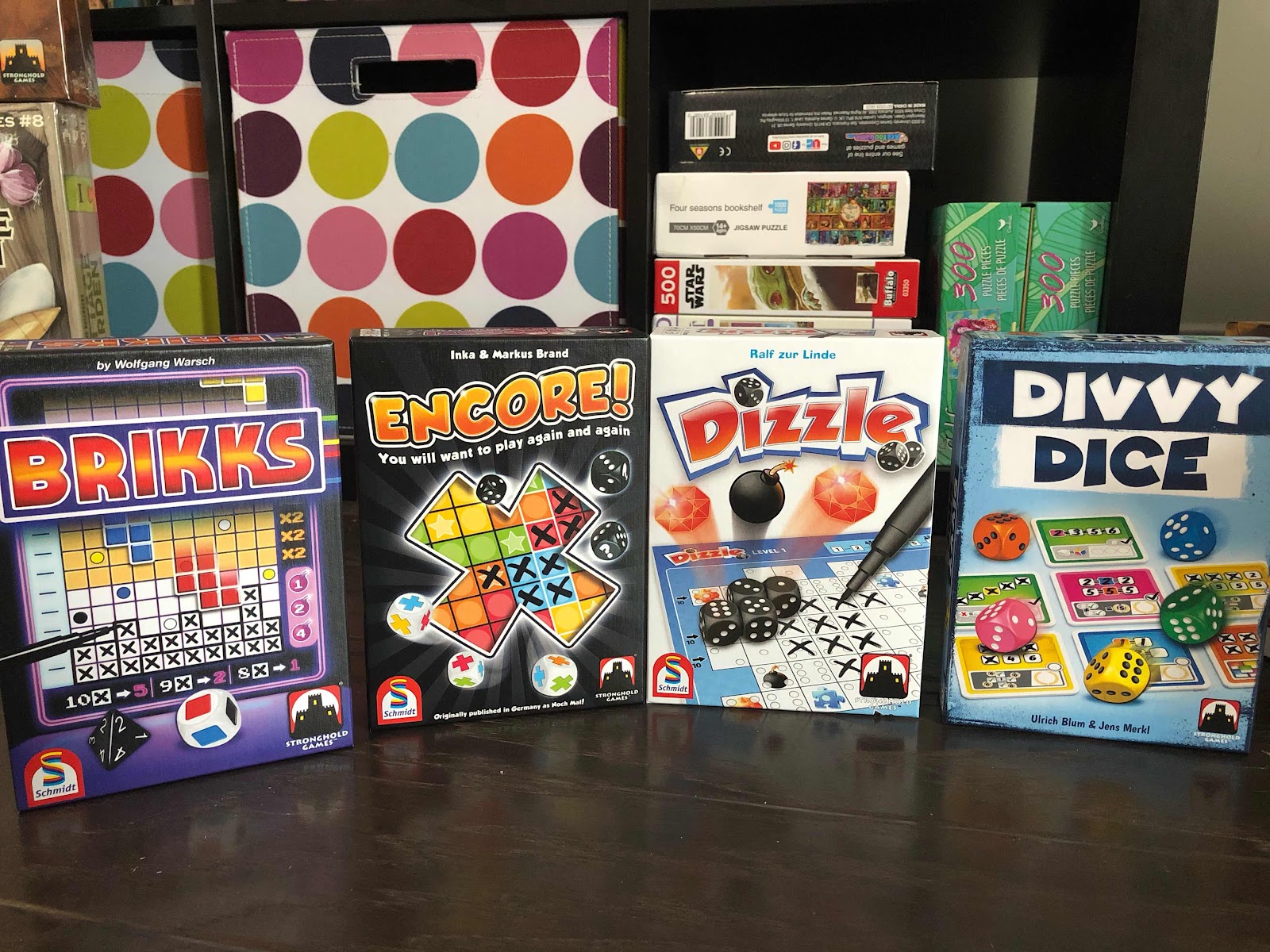 Oddly, I feel this game had some similarities with Between Two Castles of Mad King Ludwig. I say "oddly" because they are completely different games. Between Two Castles is a semi-cooperative tile laying game where you're creating castles with the person on your left and the person on your right. Divvy Dice is a dice game that is not cooperative in any way. But the scoring mechanisms are very similar. The scoring has more to do with which colors/types of cards you choose and how you place them in a 3x3 grid. I found it to be the most challenging of the 4 roll & writes in this review, but also possibly the most fun!